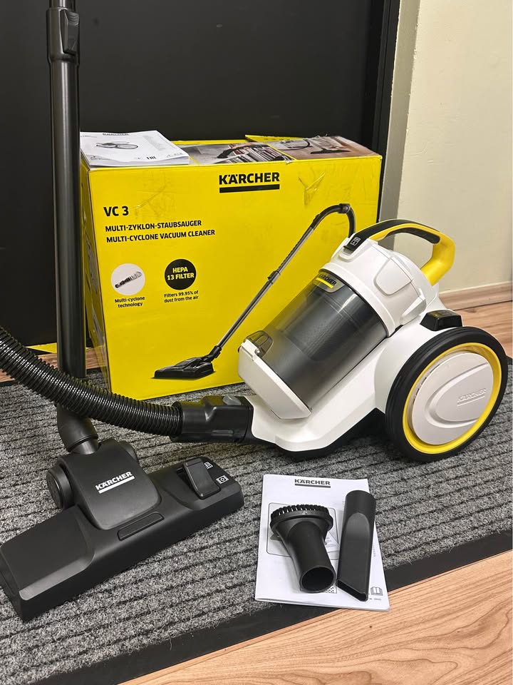 Multitsüklonitehnoloogial põhinev kompaktne kanistertolmuimeja VC 3 võimaldab masinat kasutada ilma filtrikotita. See väldib vajadust vahetada ja osta uusi kalleid filtrikotte. Samuti on kohe näha, kui läbipaistvat jäätmekonteinerit on vaja tühjendada. Lisaks ei tekita kotita süsteem ebameeldivaid lõhnu. Tänu oma kompaktsusele sobib tolmuimeja VC 3 ideaalselt mitmesugusteks töödeks korterites ja väiksemates majades. Piluotsik ja pehme tolmuhari võimaldavad põhjalikult puhastada nii kitsaid pragusid ja tundlikke pindu kui ka kõvasid põrandaid ja vaipu.
