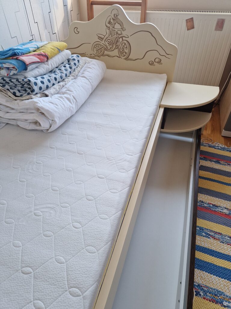 Väga heas seisukorras lastevoodi avara sahtli, öökapi ja madratsiga: