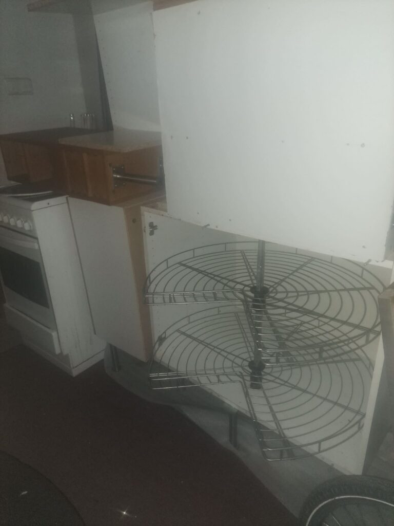 Saadaval on karusselliga nurgakapp, 1 ühe uksega kapp ja cargokapp. Kaasa tulevad töötasapinnad. Kauba peale saab ka katkise kraanikausikapi koos kraanikausiga, vajadusel saaks ust kasutada mõnele teisele kapile ja kitsa sahtlitega riiuli. Kõigil metalljalad, mida saab natuke reguleerida. Hetkel ei ole paremaid pilte, kuna mööbel on lahti monteeritud. Mööbel saepuruplaadist, uksed puidust.