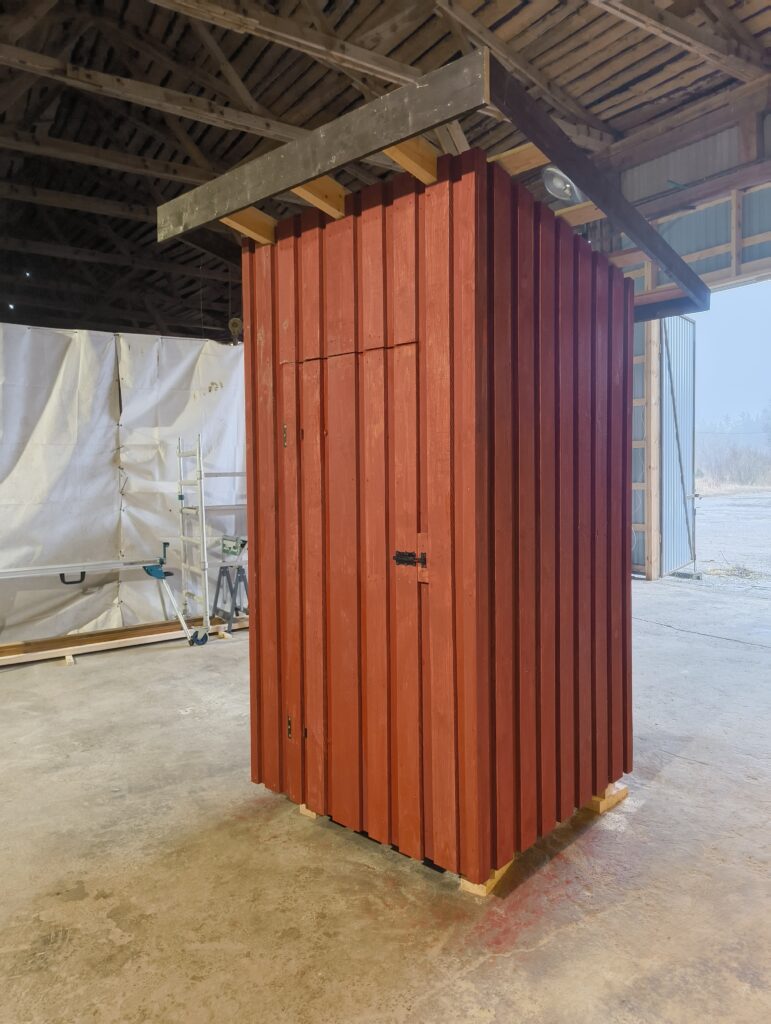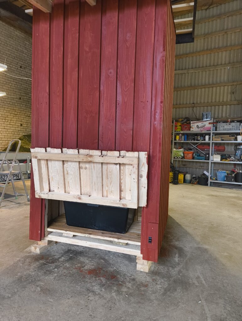 50x100mm karkass, kaetud puidust laudisega, viimistletud klassikalise Rootsi punasega. Istumisosa ja põrand süvaimmutatud materjalist, katusel plekk või kärgkate.