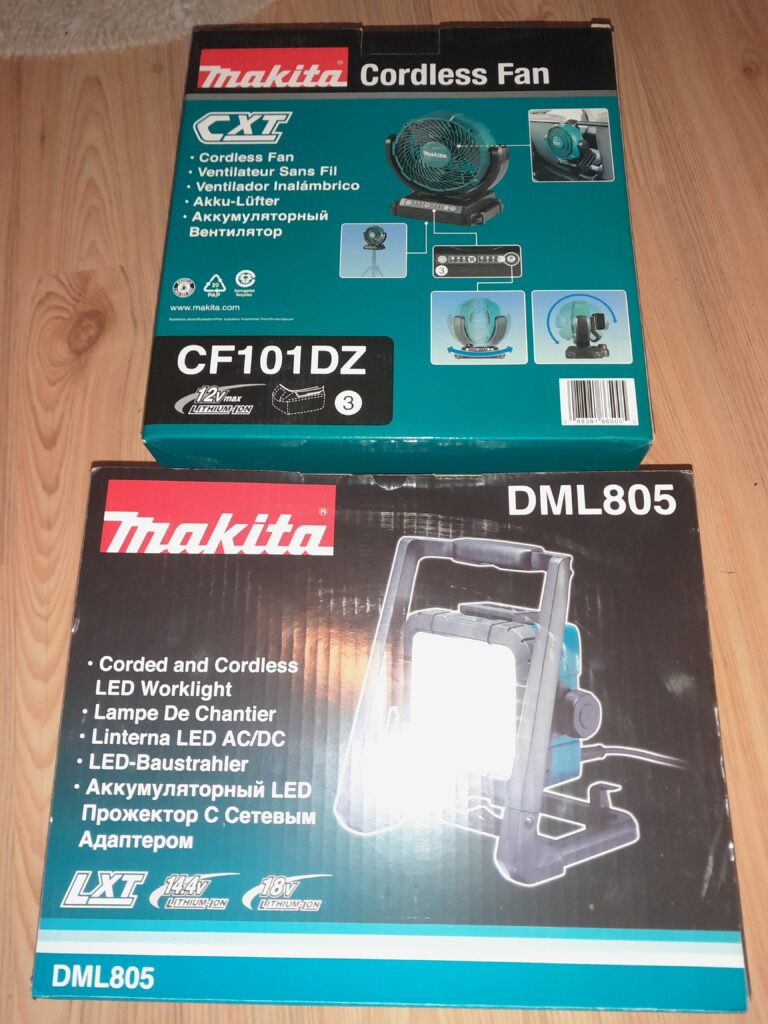 Makita ventilaator CF101DZ ja led prozektor DML805.Mõlemad uued ja pakendis.