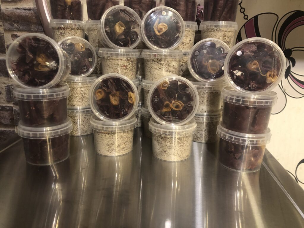 Samas kuivatatud õunad, kadakamarjasool, rullkommid 2€ ja kuivatatud kollakas kukeseen 5€