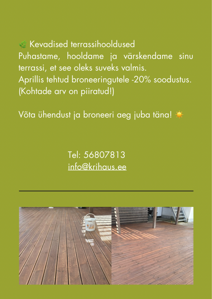 Puhastame, hooldame ja värskendame sinu terrassi, et see oleks suveks valmis. Aprillis tehtud broneeringutele 20% soodustus. Kohtade arv on piiratud!