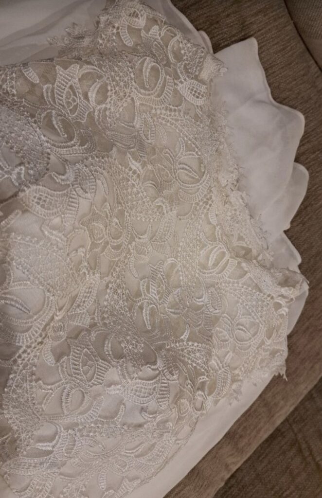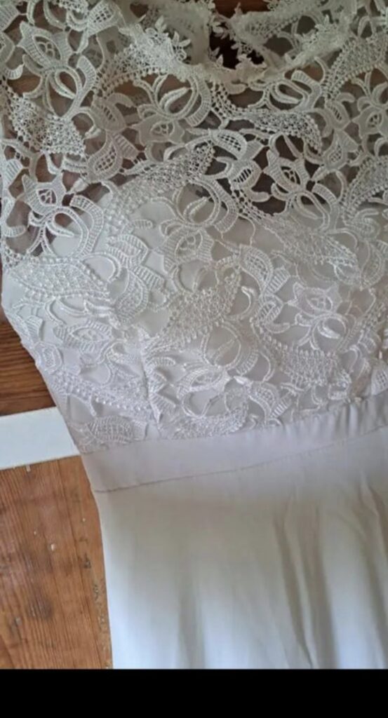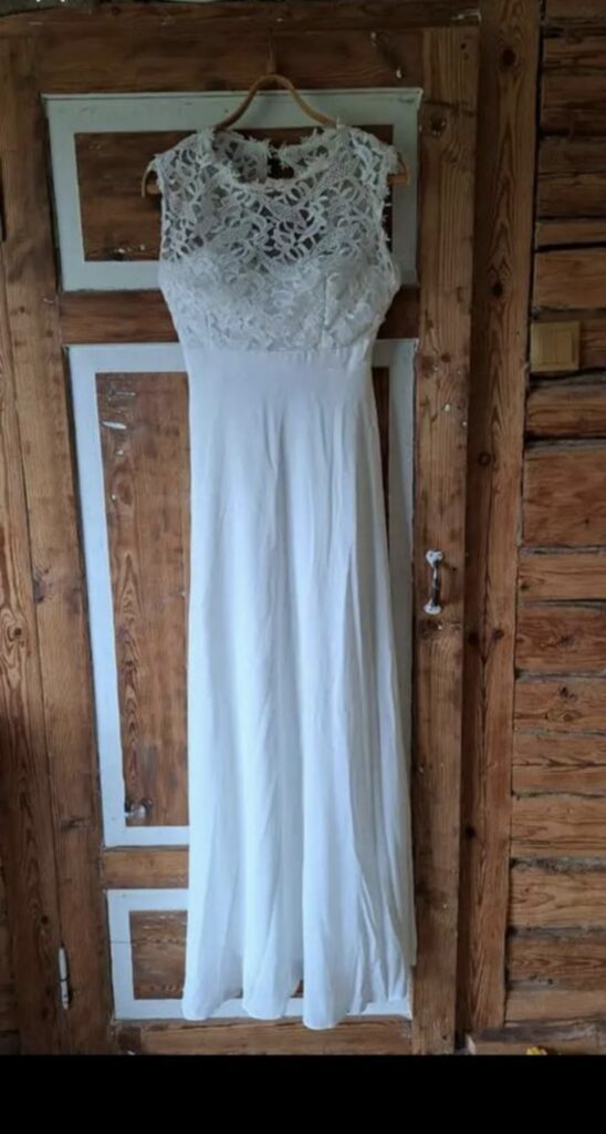 Kleit on ostetud uuena (75€) ja on kantud ainult paar tundi abielu registreerimisel. Kuna pulmapidu polnud ,siis kolis kleit kohe kappi ja on valmis kellegi tähtsaks päevaks uuesti sealt naasma :)